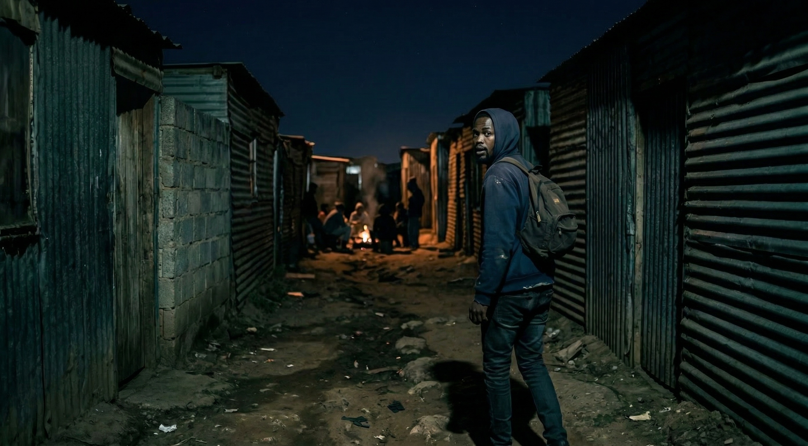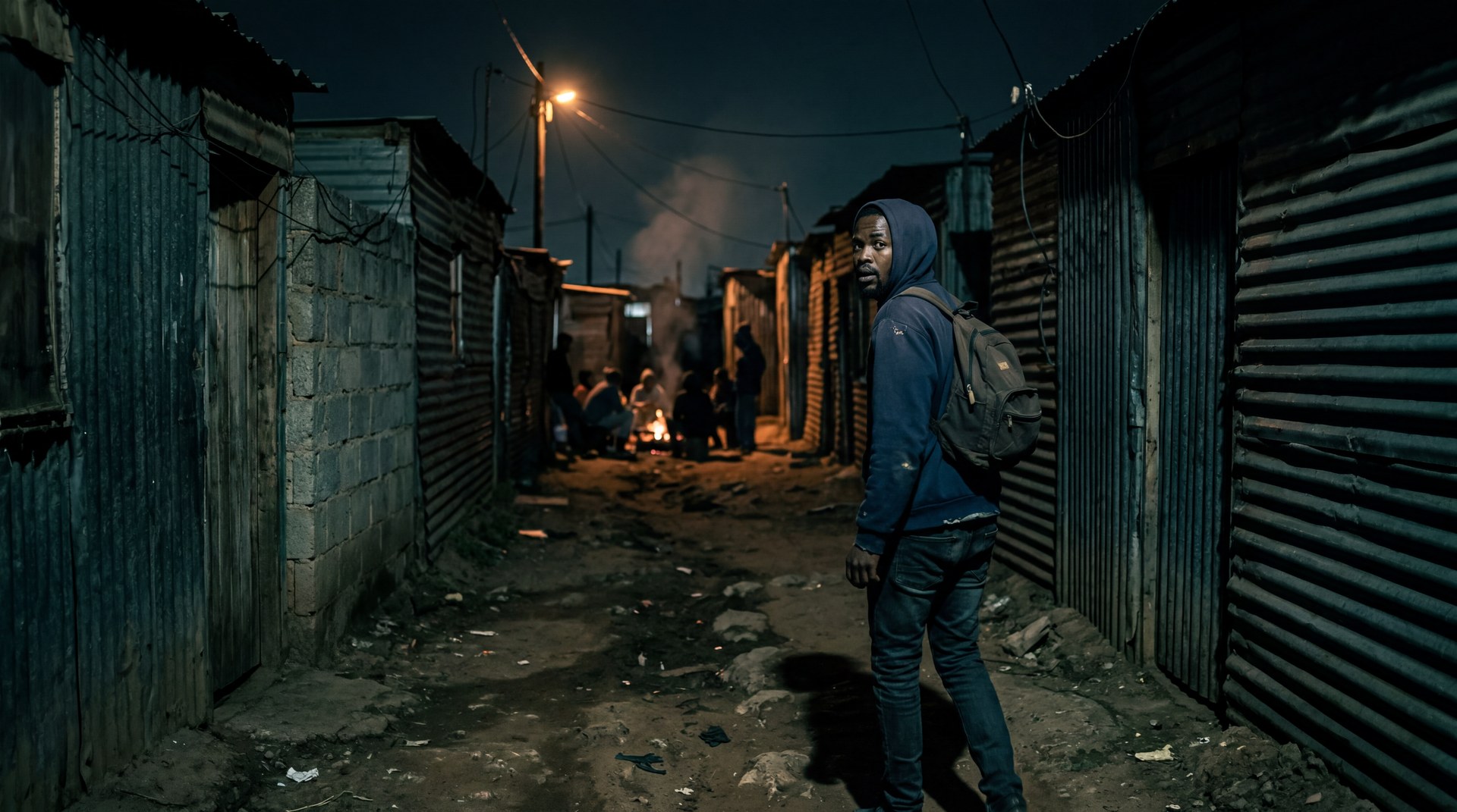 "Remove the telephone pole and all power lines and electrical wires. The street lamp should also be removed. Replace with clear dark sky. Everything else — man, hoodie, shacks, muddy ground, fire, people — must remain exactly the same."